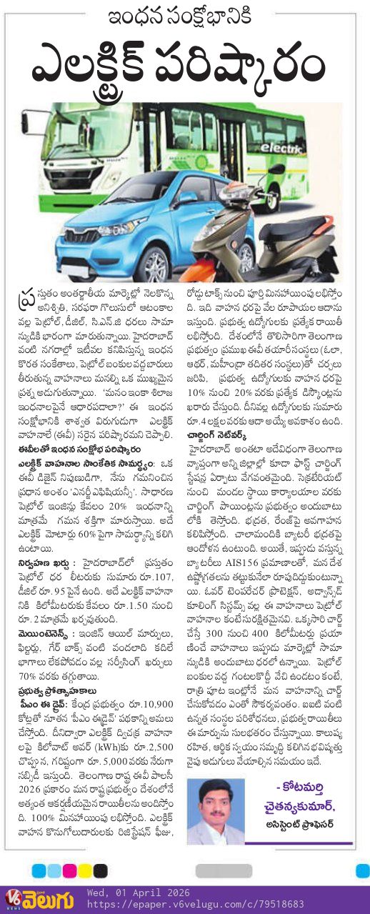 Mr. Kotamarthi Chaitanya Kumar (Assistant Professor,EEE Department) has Published an Article On Current Fuel Crises And Transition to Electric Vehicles In V6 Velugu Newspaper.
